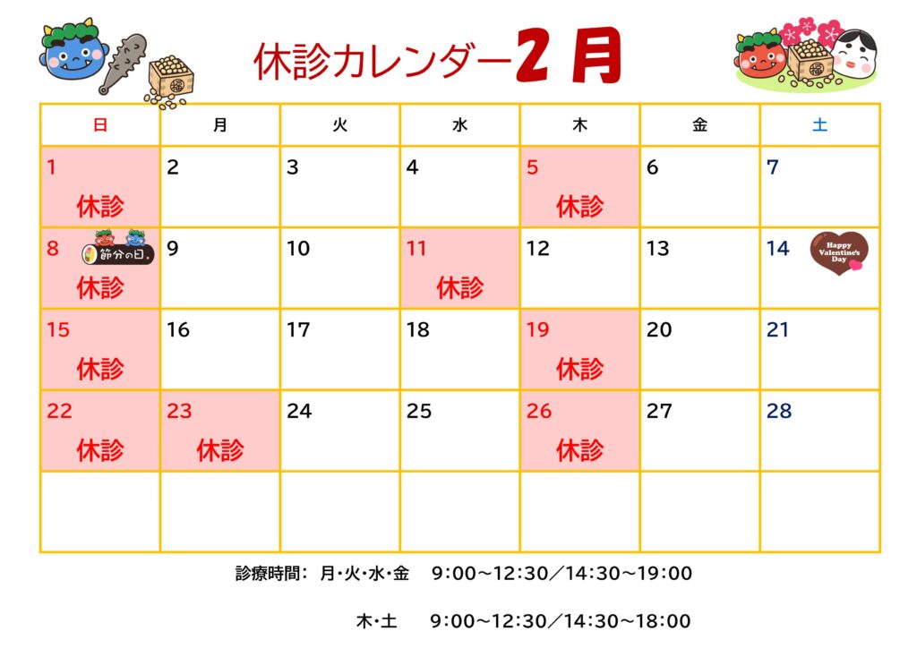 診療のご案内★2/12(木) 未分類 2026.02.07 令和8年2月12日(木)は診療日となります。 午前 9:00~12:30 午後 14:30~18:00 となります💁 ネット予約は24時間受付中です! 当日もお電話&ネット予約が可能となります。 よろしくお願いします☺
